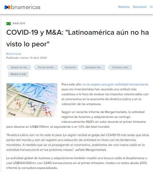 “América Latina aún no ha visto lo peor. La región recibió el golpe del COVID-19 más tarde que otras partes del mundo y aún así registró una reducción de actividad en línea con las tendencias mundiales. A medida que se va propagando el coronavirus, podríamos ver una nueva caída en la actividad transaccional en los próximos meses”, señaló Mergermarket.