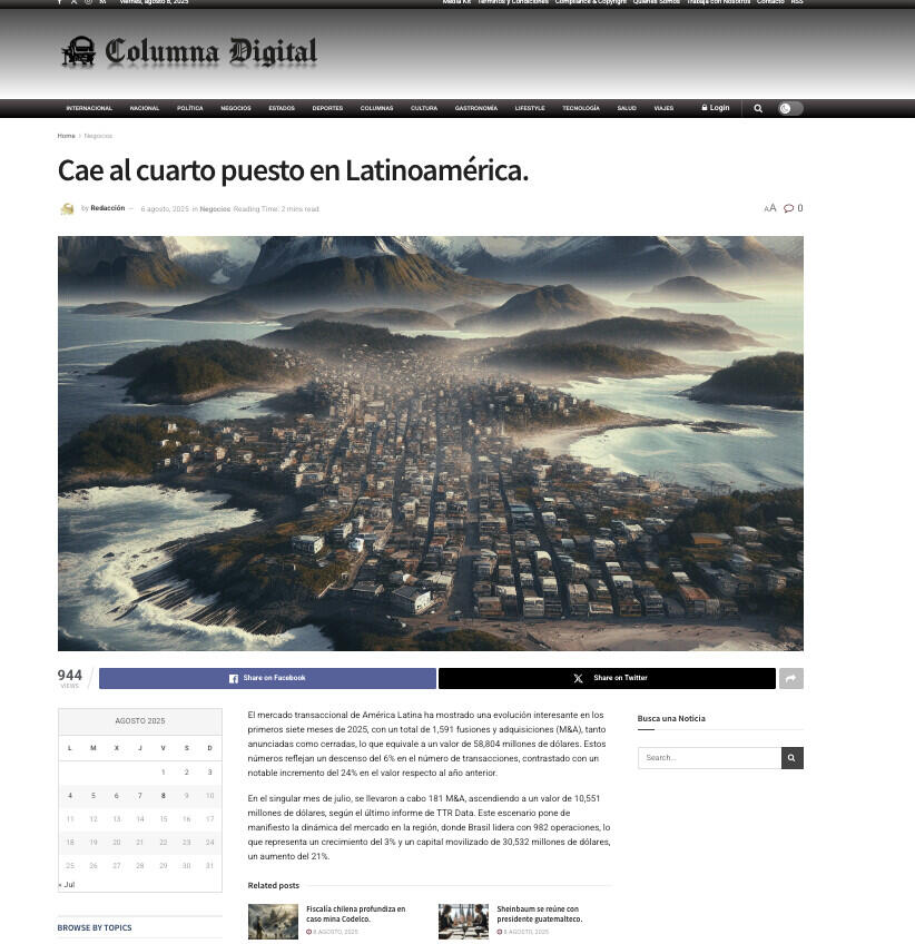 Esta información, datada el 6 de agosto de 2025, proporciona un panorama claro de las tendencias en fusiones y adquisiciones en América Latina, un sector que, a pesar de los desafíos, sigue siendo vital para la economía regional y global.