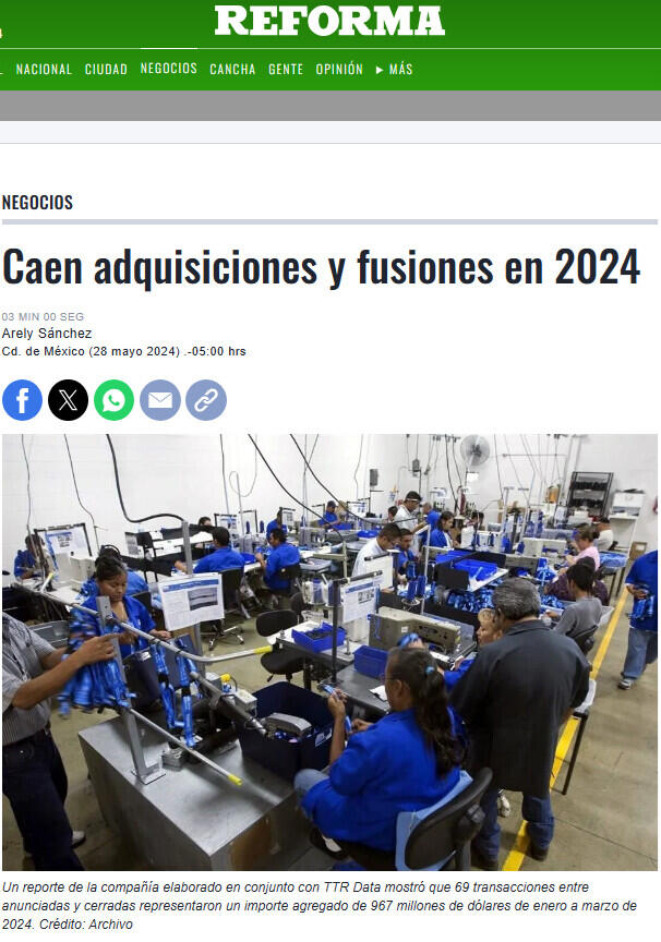 Un reporte de la compañía elaborado en conjunto con TTR Data mostró que 69 transacciones entre anunciadas y cerradas representaron un importe agregado de 967 millones de dólares de enero a marzo de 2024.