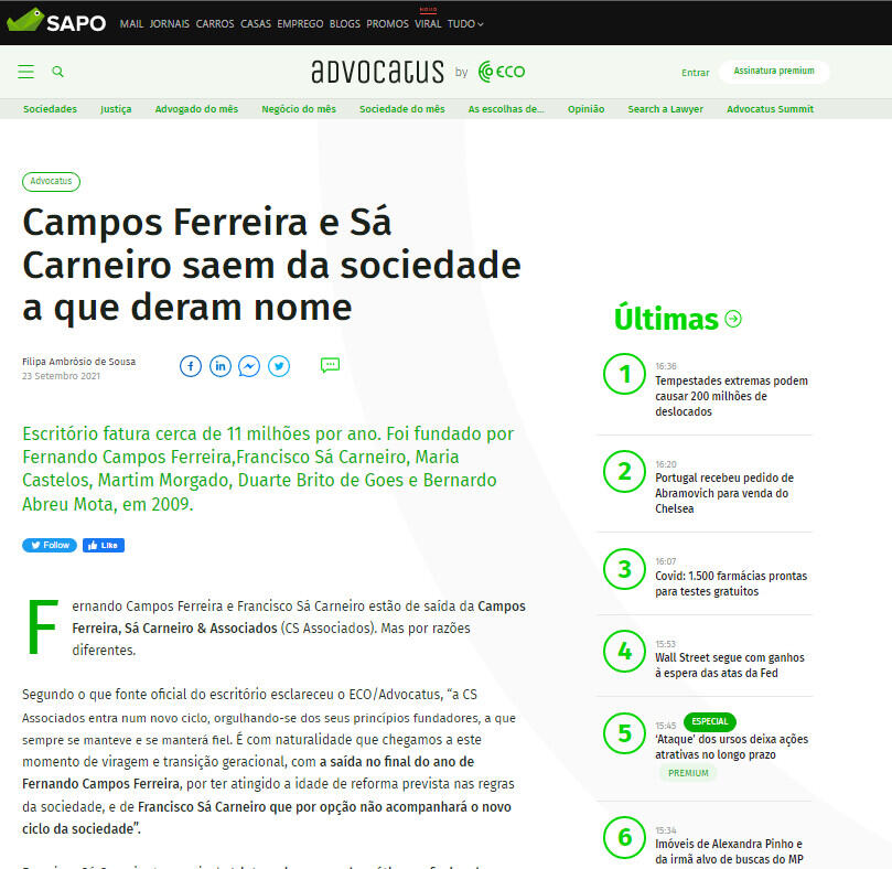 Segundo o que fonte oficial do escritório esclareceu o ECO/Advocatus, “a CS Associados entra num novo ciclo, orgulhando-se dos seus princípios fundadores, a que sempre se manteve e se manterá fiel. É com naturalidade que chegamos a este momento de viragem e transição geracional, com a saída no final do ano de Fernando Campos Ferreira, por ter atingido a idade de reforma prevista nas regras da sociedade, e de Francisco Sá Carneiro que por opção não acompanhará o novo ciclo da sociedade”.