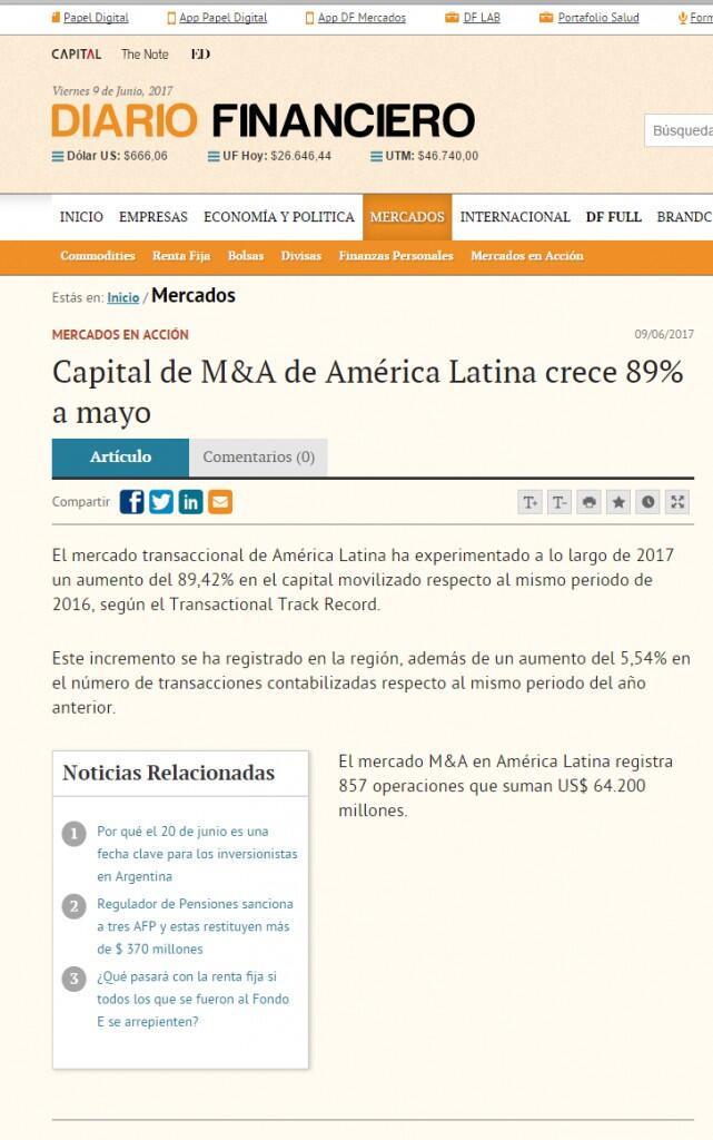 El mercado transaccional de América Latina ha experimentado a lo largo de 2017 un aumento del 89,42% en el capital movilizado respecto al mismo periodo de 2016, según Transactional Track Record.