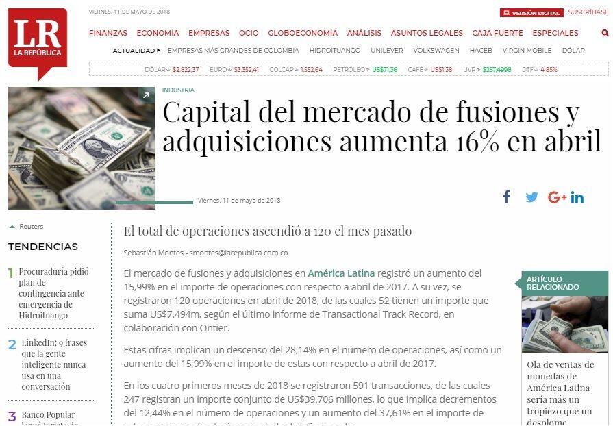 El mercado de fusiones y adquisiciones en América Latina registró un aumento del 15,99% en el importe de operaciones con respecto a abril de 2017. A su vez, se registraron 120 operaciones en abril de 2018, de las cuales 52 tienen un importe que suma US$7.494m, según el último informe de Transactional Track Record, en colaboración con Ontier.