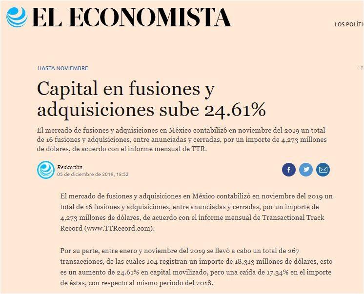 El mercado de fusiones y adquisiciones en México contabilizó en noviembre del 2019 un total de 16 fusiones y adquisiciones, entre anunciadas y cerradas, por un importe de 4,273 millones de dólares, de acuerdo con el informe mensual de Transactional Track Record (www.TTRecord.com).