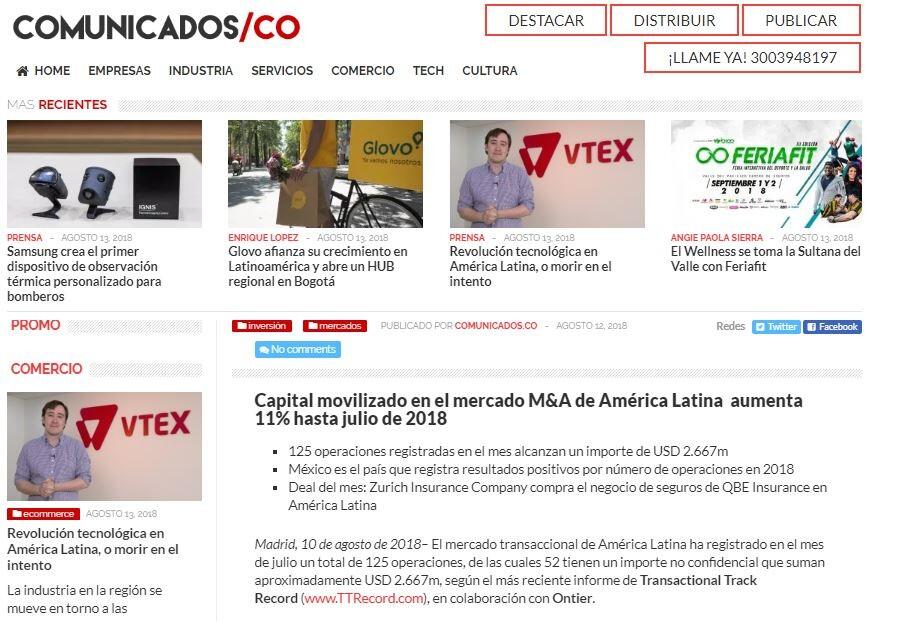 Capital movilizado en el mercado M&A de América Latina aumenta 11% hasta julio de 2018