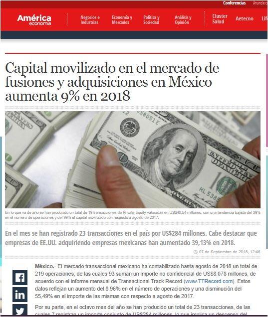 Capital movilizado en el mercado de fusiones y adquisiciones en México aumenta 9% en 2018