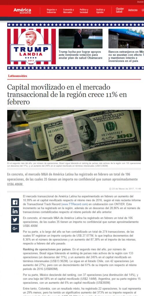 El mercado transaccional de América Latina ha experimentado en febrero un aumento del 10,99% en el capital movilizado respecto al mismo mes de 2016, según el más reciente informe de Transactional Track Record en colaboración con ONTIER. Este incremento se ha registrado en la región, además de un descenso del 28,86% en el número de transacciones contabilizadas respecto al mismo periodo del año anterior.