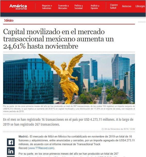 El mercado de M&A en México ha contabilizado en noviembre de 2019 un total de 16 fusiones y adquisiciones, entre anunciadas y cerradas, por un importe agregado de US$4.273,11 millones, de acuerdo con el informe mensual de Transactional Track Record (www.TTRecord.com).