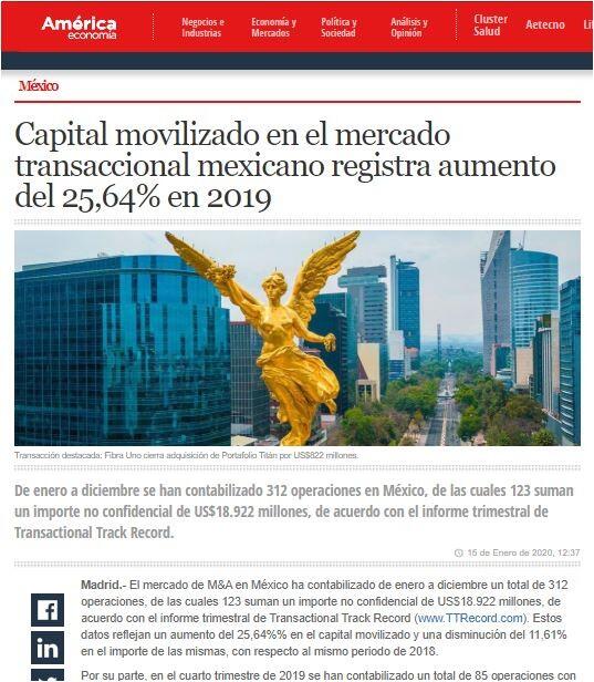 Capital movilizado en el mercado transaccional mexicano registra aumento del 25,64% en 2019