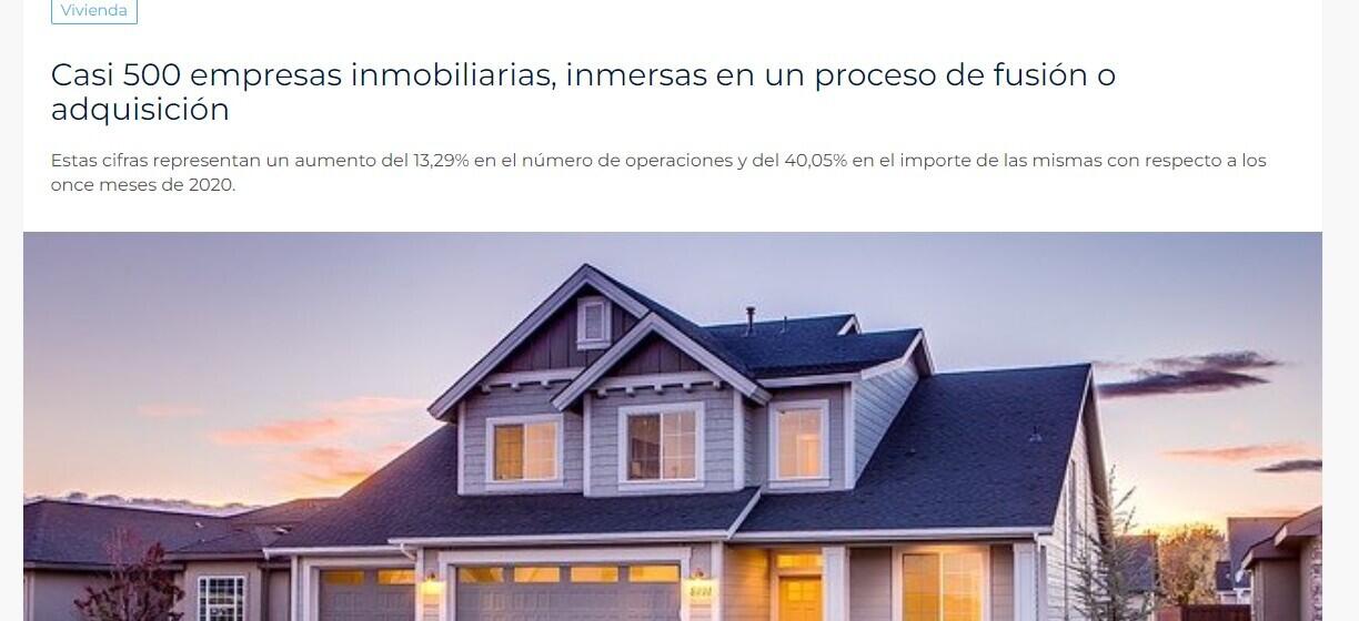 Un total de 486 empresas del sector inmobiliario han estado inmersas en un proceso de fusión, adquisición o ambos hasta noviembre de 2021, por un importe total de 9.556 millones de euros, según datos de Transactional Track Record. Estas cifras representan un aumento del 13,29% en el número de operaciones y del 40,05% en el importe de las mismas, con respecto a los once meses de 2020.