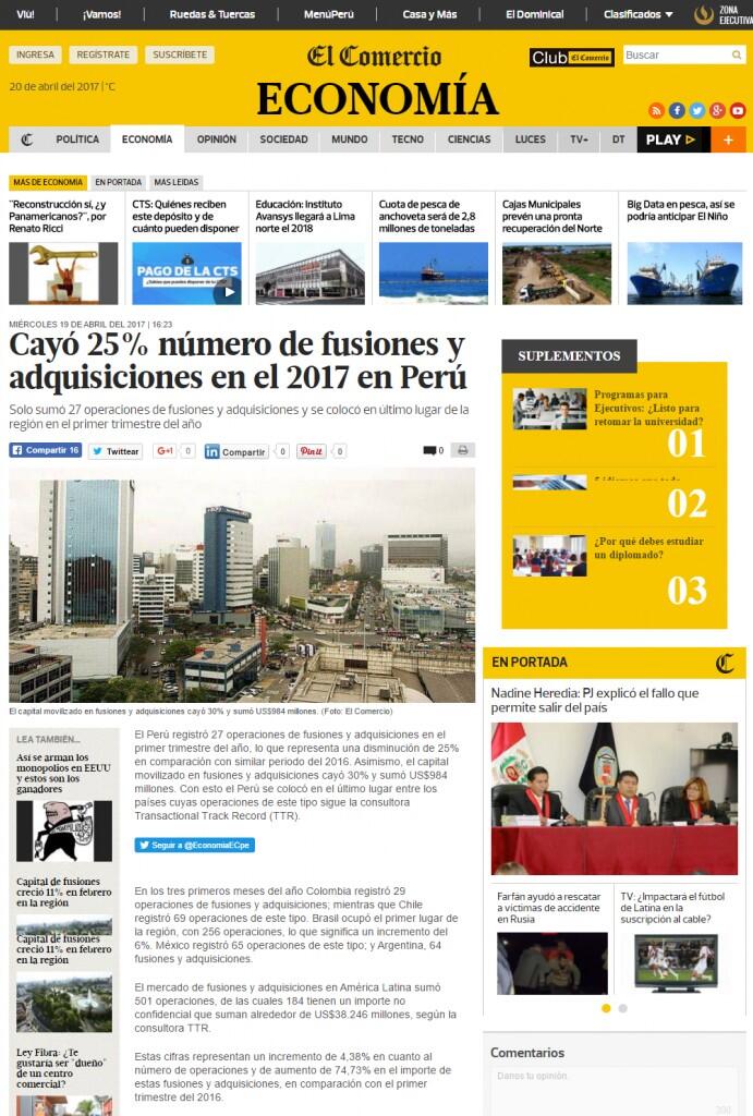 El Perú registró 27 operaciones de fusiones y adquisiciones en el primer trimestre del año, lo que representa una disminución de 25% en comparación con similar periodo del 2016. Asimismo, el capital movilizado en fusiones y adquisiciones cayó 30% y sumó US$984 millones. Con esto el Perú se colocó en el último lugar entre los países cuyas operaciones de este tipo sigue la consultora Transactional Track Record (TTR).