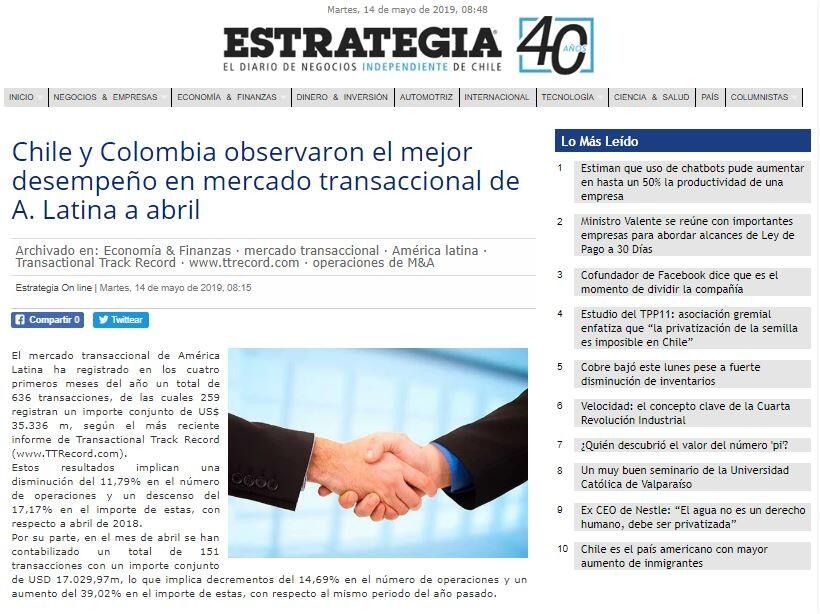 Chile y Colombia observaron el mejor desempeņo en mercado transaccional de A. Latina a abril