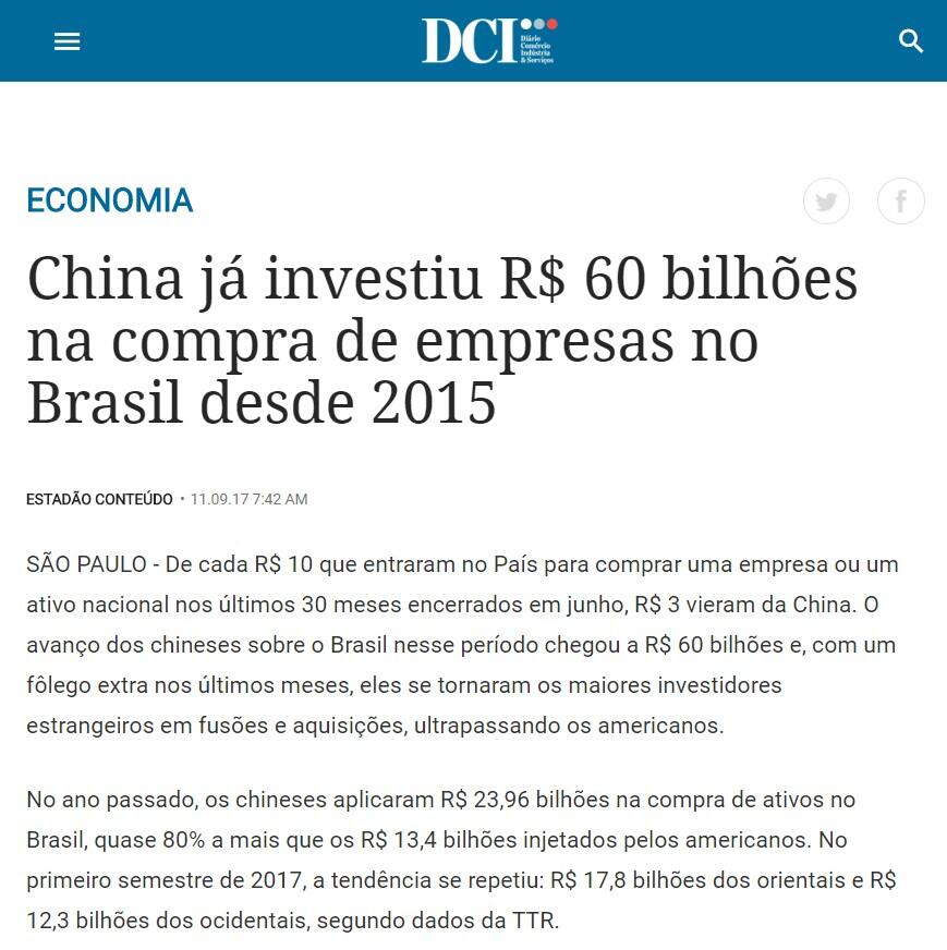 No ano passado, os chineses aplicaram R$ 23,96 bilhões na compra de ativos no Brasil, quase 80% a mais que os R$ 13,4 bilhões injetados pelos americanos. No primeiro semestre de 2017, a tendência se repetiu: R$ 17,8 bilhões dos orientais e R$ 12,3 bilhões dos ocidentais, segundo dados da TTR.