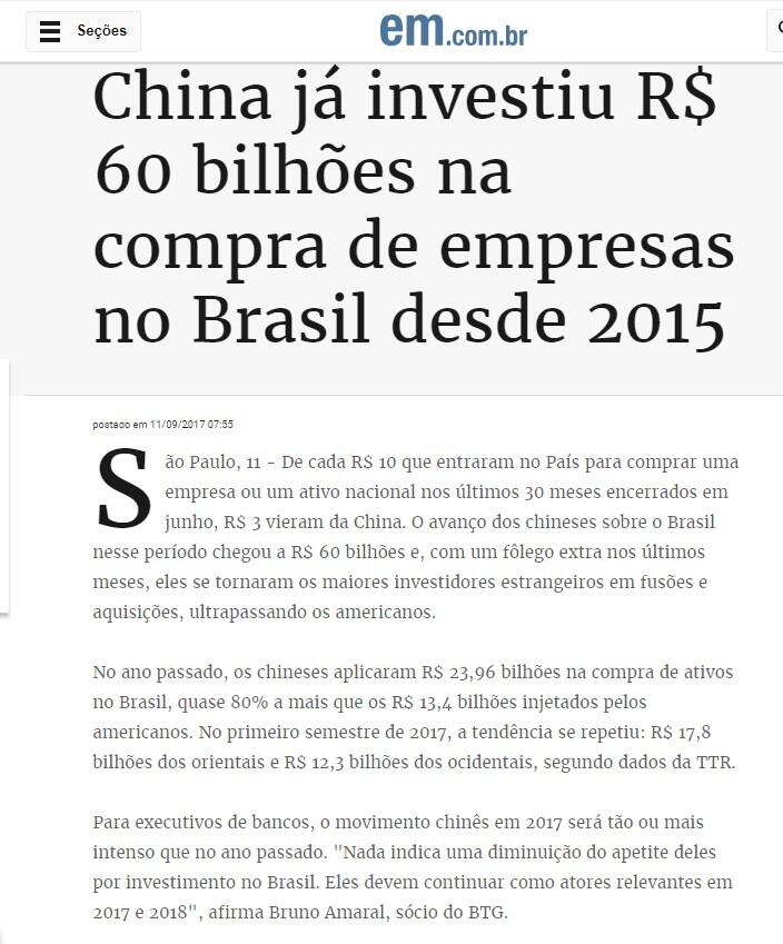 ão Paulo, 11 - De cada R$ 10 que entraram no País para comprar uma empresa ou um ativo nacional nos últimos 30 meses encerrados em junho, R$ 3 vieram da China. O avanço dos chineses sobre o Brasil nesse período chegou a R$ 60 bilhões e, com um fôlego extra nos últimos meses, eles se tornaram os maiores investidores estrangeiros em fusões e aquisições, ultrapassando os americanos.