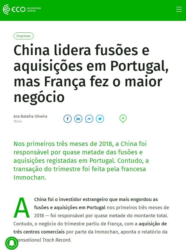 A China foi o investidor estrangeiro que mais engordou as fusões e aquisições em Portugal nos primeiros três meses de 2018 — foi responsável por quase metade do montante total. Contudo, o negócio do trimestre partiu de França, com a aquisição de três centros comerciais por parte da Immochan, aponta o relatório da Transational Track Record.