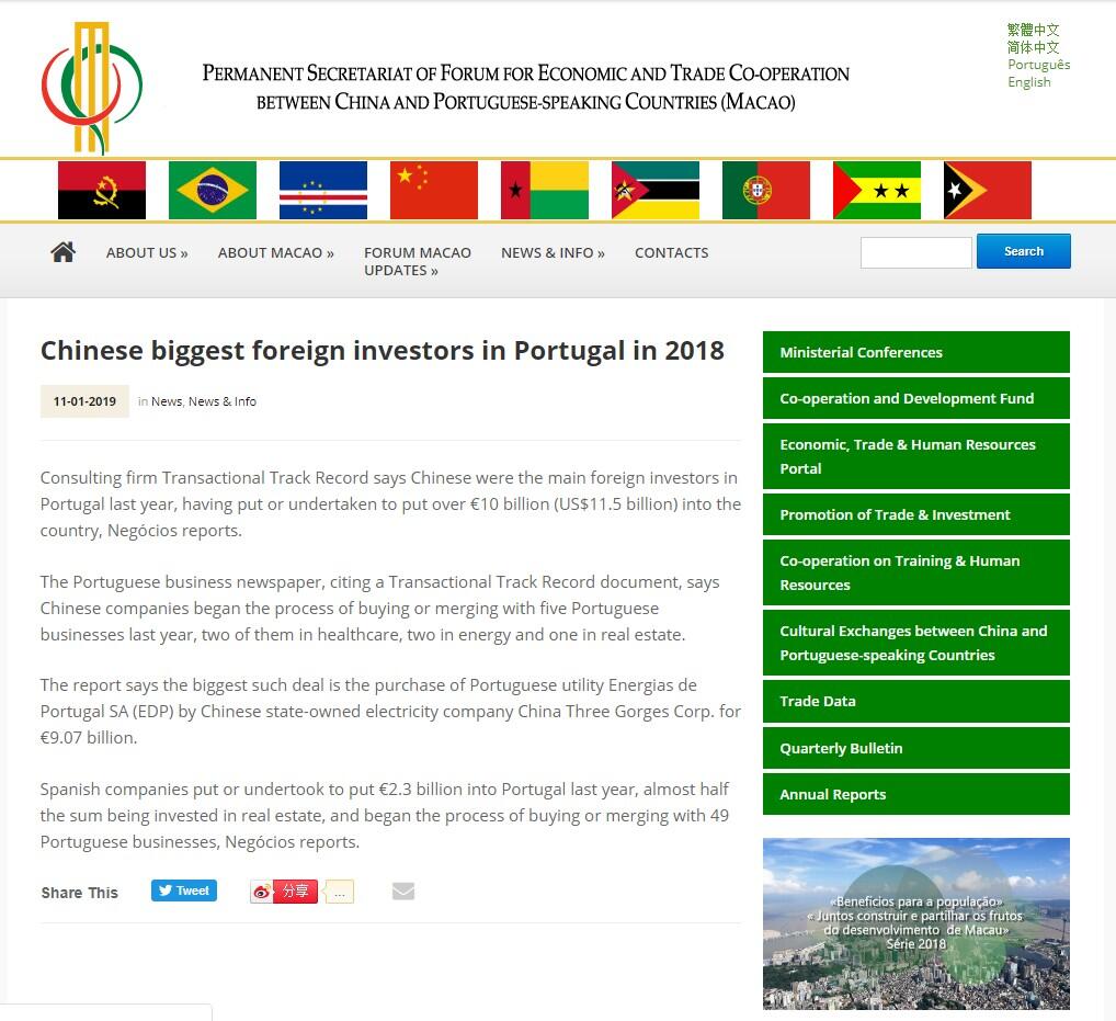 Consulting firm Transactional Track Record says Chinese were the main foreign investors in Portugal last year, having put or undertaken to put over €10 billion (US$11.5 billion) into the country, Negócios reports.