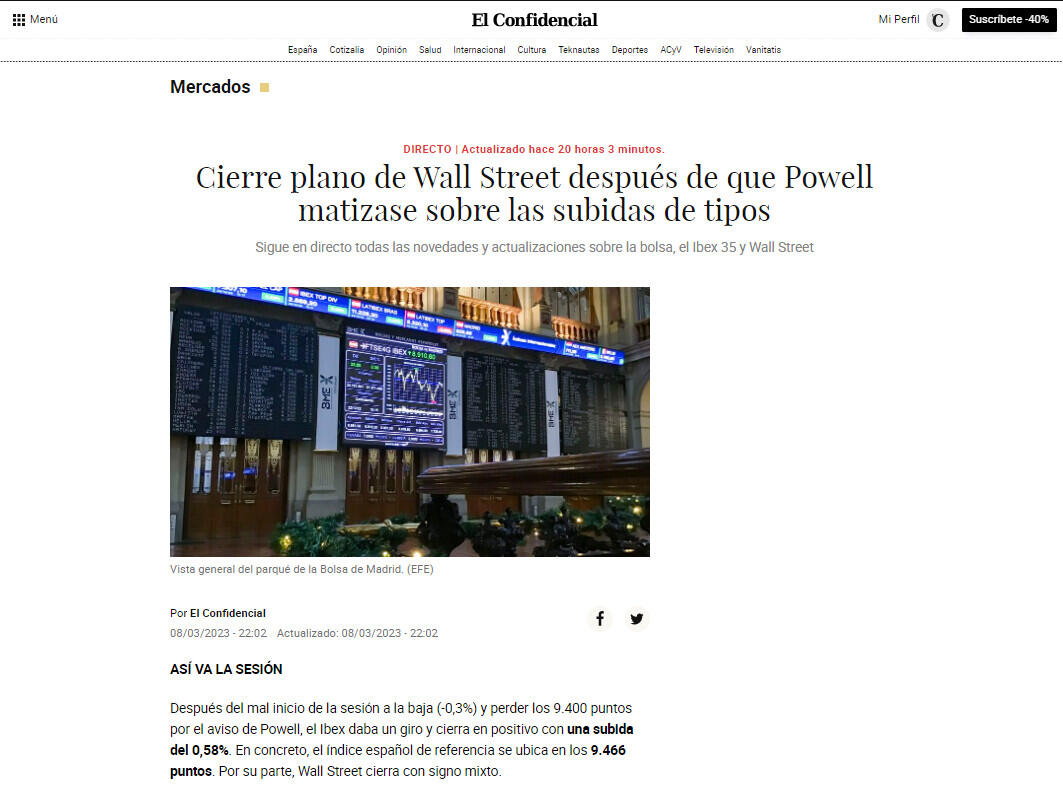 Después del mal inicio de la sesión a la baja (-0,3%) y perder los 9.400 puntos por el aviso de Powell, el Ibex daba un giro y cierra en positivo con una subida del 0,58%. En concreto, el índice español de referencia se ubica en los 9.466 puntos. Por su parte, Wall Street cierra con signo mixto.