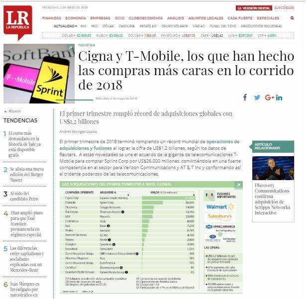 El primer trimestre de 2018 terminó rompiendo un récord mundial de operaciones de adquisiciones y fusiones al lograr la cifra de US$1,2 billones, según los datos de Reuters. A estas novedades se une el acuerdo de la gigante de telecomunicaciones T-Mobile para comprar Sprint Corp por US$26.000 millones, convirtiéndola en una fuerte competencia en el sector para Verizon Communications y AT & T Inc y conformando así el tridente poderoso de las telecomunicaciones.