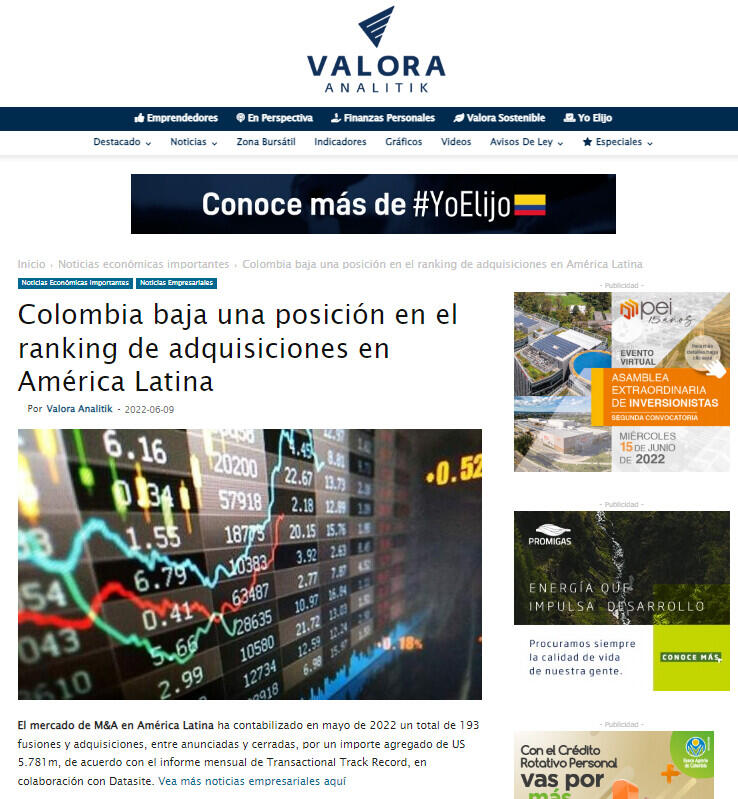 Colombia baja una posición en el ranking de adquisiciones en América Latina