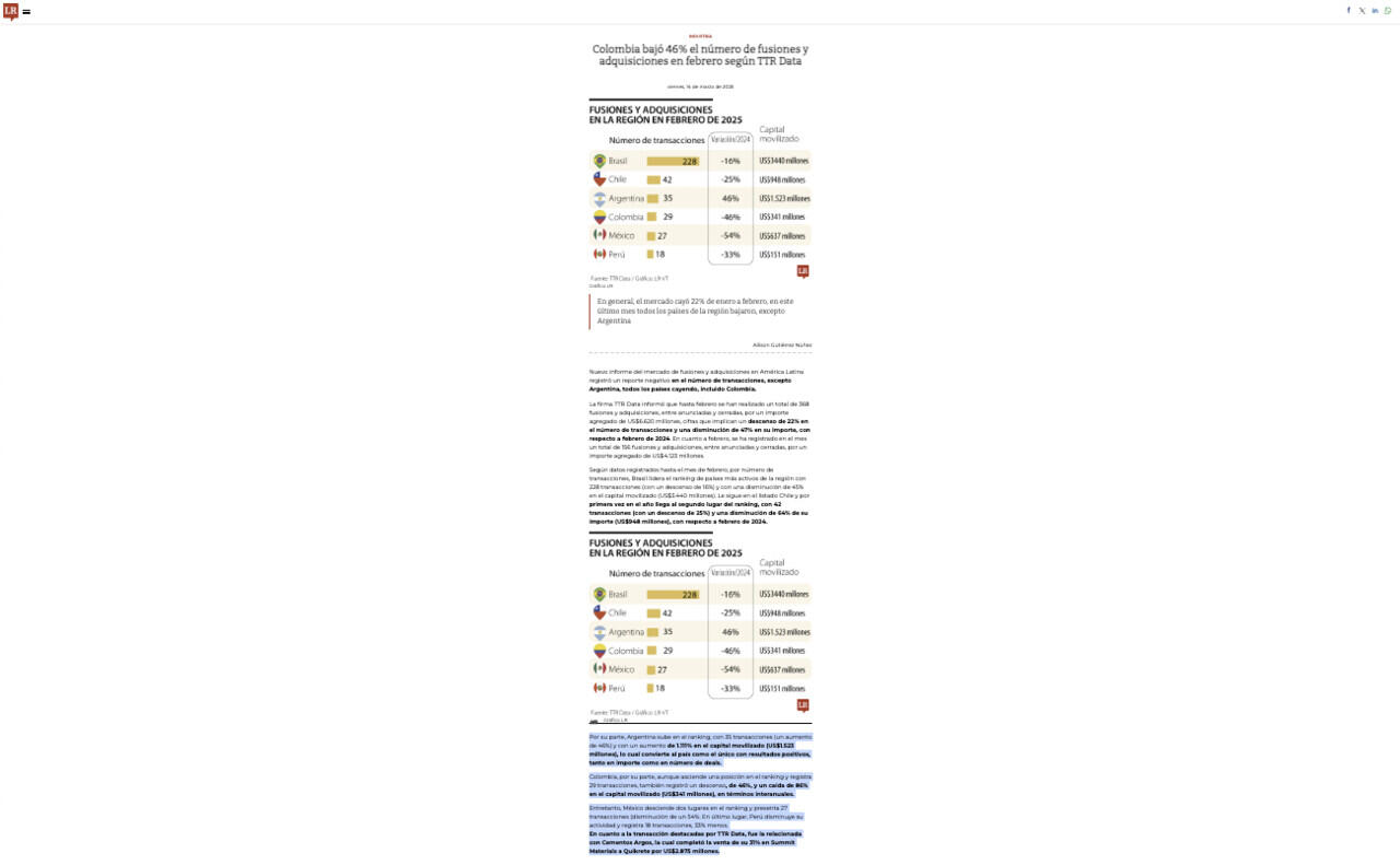 Colombia bajó 46% el número de fusiones y adquisiciones en febrero según TTR Data