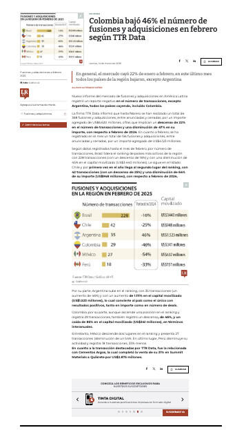 Colombia bajó 46% el número de fusiones y adquisiciones en febrero según TTR Data