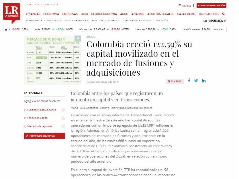 De acuerdo con el último informe de Transactional Track Record, en el tercer trimestre de este año han contabilizado 522 operaciones con un importe agregado de US$21.991 millones en la región. Además, en América Latina se han registrado 1.629 operaciones del mercado de fusiones y adquisiciones en lo corrido del año, de las cuales 666 suman un importe no confidencial de US$71.297 millones. Mostrando un crecimiento de 3,08% en el capital movilizado y una disminución en el número de operaciones del 2,22%, en relación con el mismo periodo del año anterior.