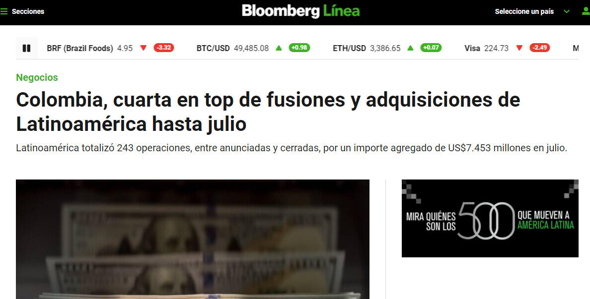 Colombia, cuarta en top de fusiones y adquisiciones de Latinoamérica hasta julio