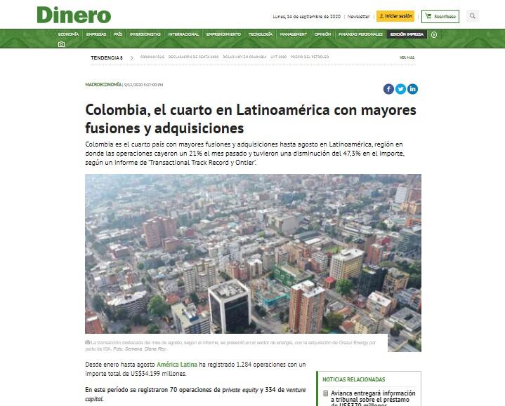 Colombia es el cuarto país con mayores fusiones y adquisiciones hasta agosto en Latinoamérica, región en donde las operaciones cayeron un 21% el mes pasado y tuvieron una disminución del 47,3% en el importe, según un informe de ‘Transactional Track Record y Ontier’.