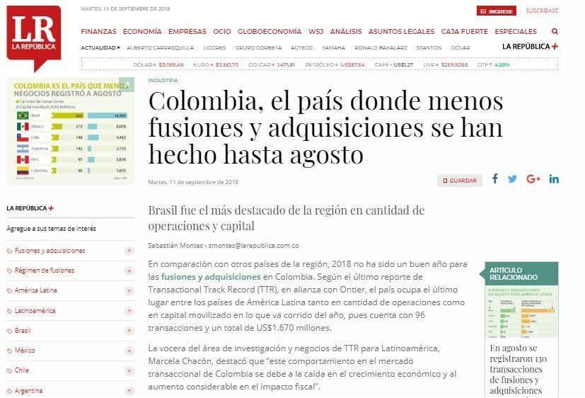 En comparación con otros países de la región, 2018 no ha sido un buen año para las fusiones y adquisiciones en Colombia. Según el último reporte de Transactional Track Record (TTR), en alianza con Ontier, el país ocupa el último lugar entre los países de América Latina tanto en cantidad de operaciones como en capital movilizado en lo que va corrido del año, pues cuenta con 96 transacciones y un total de US$1.670 millones.