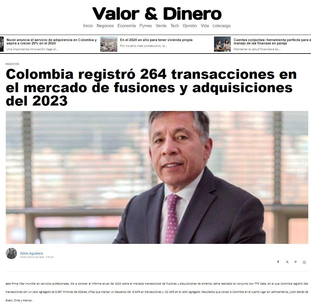 Aon firma líder mundial en servicios profesionales, dio a conocer el informe anual del 2023 sobre el mercado transaccional de fusiones y adquisiciones de América Latina realizado en conjunto con TTR Data, en el que Colombia registró 264 transacciones con un valor agregado de 5.097 millones de dólares; cifras que marcan un descenso del -5.04% en transacciones y -32.34% en el valor agregado. Resultados que ubican a Colombia en el cuarto lugar en Latinoamérica, justo detrás de Brasil, Chile y México.