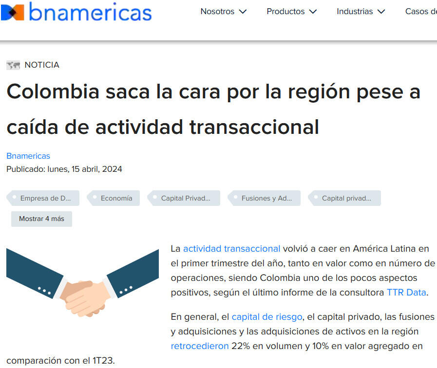 La actividad transaccional volvió a caer en América Latina en el primer trimestre del año, tanto en valor como en número de operaciones, siendo Colombia uno de los pocos aspectos positivos, según el último informe de la consultora TTR Data.