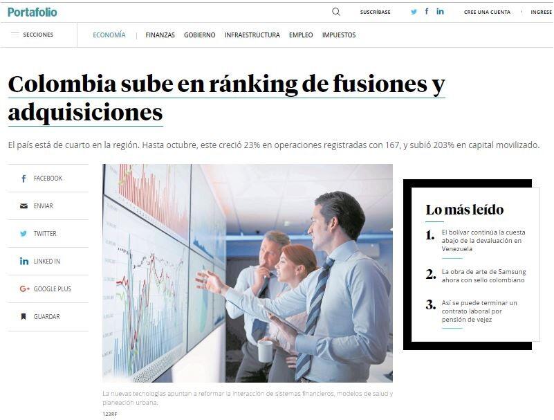 Colombia sube en ránking de fusiones y adquisiciones
