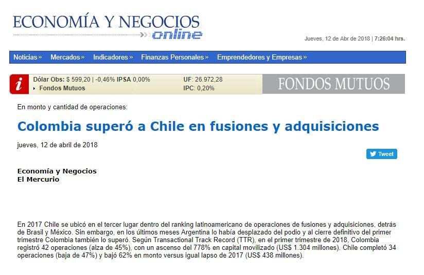 En 2017 Chile se ubicó en el tercer lugar dentro del ranking latinoamericano de operaciones de fusiones y adquisiciones, detrás de Brasil y México. Sin embargo, en los últimos meses Argentina lo había desplazado del podio y al cierre definitivo del primer trimestre Colombia también lo superó.