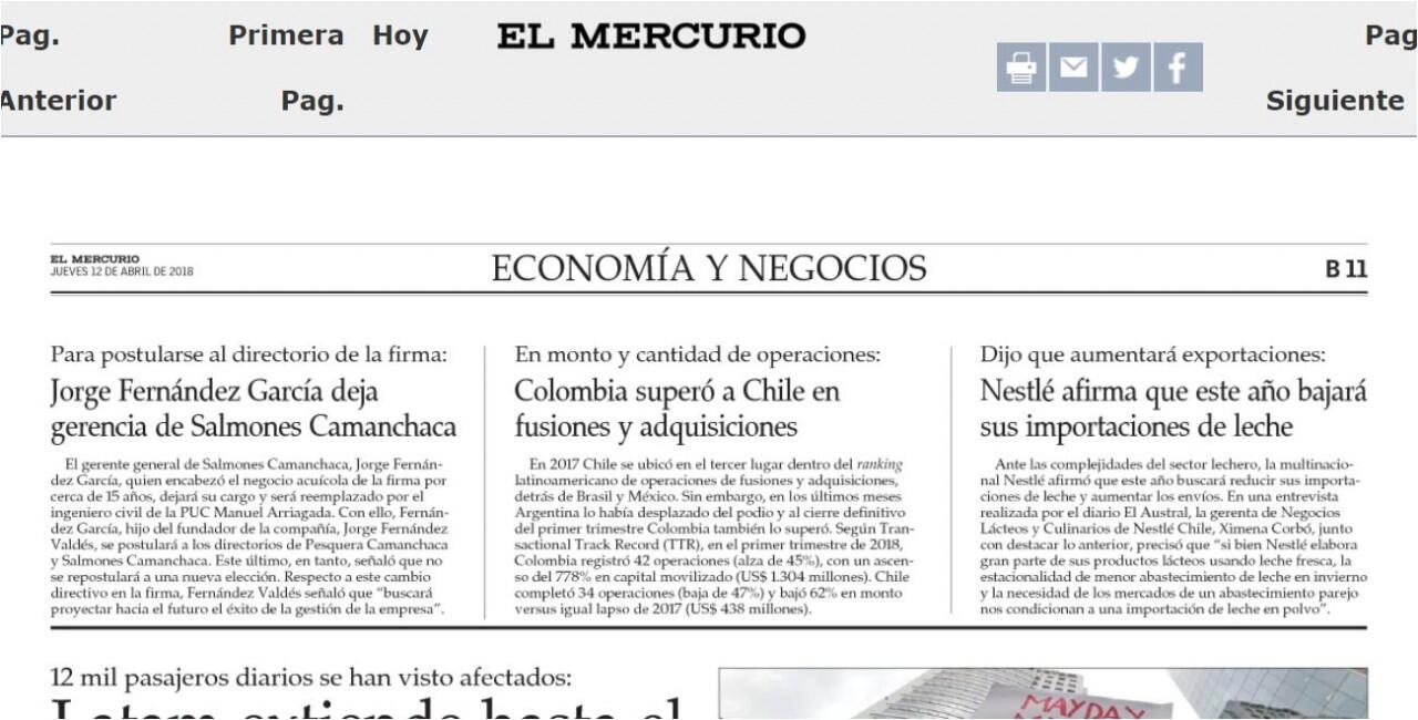 En 2017 Chile se ubicó en el tercer lugar dentro del ranking latinoamericano de operaciones de fusiones y adquisiciones, detrás de Brasil y México. Sin embargo, en los últimos meses Argentina lo había desplazado del podio y al cierre definitivo del primer trimestre Colombia también lo superó.