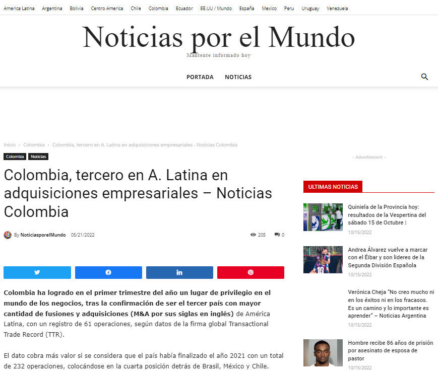 Colombia ha logrado en el primer trimestre del año un lugar de privilegio en el mundo de los negocios, tras la confirmación de ser el tercer país con mayor cantidad de fusiones y adquisiciones (M&A por sus siglas en inglés) de América Latina, con un registro de 61 operaciones, según datos de la firma global Transactional Trade Record (TTR).