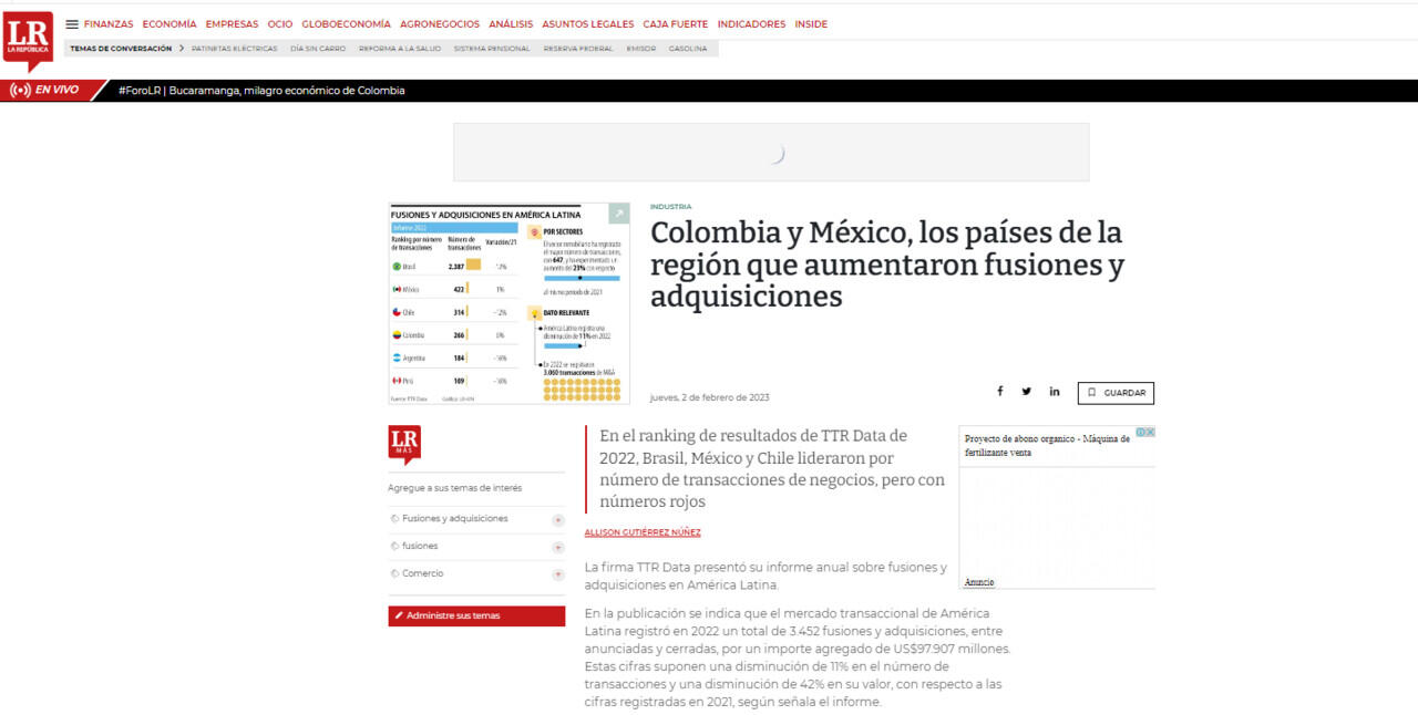 La firma TTR Data presentó su informe anual sobre fusiones y adquisiciones en América Latina.
