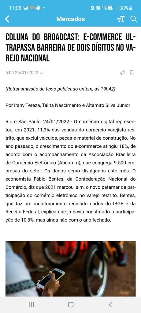 O comércio digital representou, em 2021, 11,3% das vendas do comércio varejista restrito, que exclui veículos, peças e material de construção. No ano passado, o crescimento do e-commerce atingiu 18%, de acordo com o acompanhamento da Associação Brasileira de Comércio Eletrônico (Abcomm), que congrega 9.500 empresas do setor. Os dados serão divulgados este mês. O economista Fábio Bentes, da Confederação Nacional do Comércio, diz que 2021 marcou, sim, o novo patamar de participação do comércio eletrônico no varejo restrito. Bentes, que faz um monitoramento reunindo dados do IBGE e da Receita Federal, explica que já havia constatado a participação de 10,8%, mas ainda não com o ano fechado.