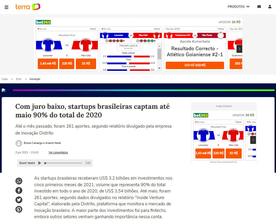 As startups brasileiras receberam US$ 3,2 bilhões em investimentos nos cinco primeiros meses de 2021, volume que representa 90% do total investido em todo o ano de 2020, de US$ 3,54 bilhões. Até maio, foram 261 aportes, segundo dados divulgados no relatório "Inside Venture Capital", elaborado pela Distrito, plataforma que monitora o mercado de inovação brasileiro. A maior parte dos investimentos foi para fintechs, embora outros setores venham ganhando importância nessa conta.