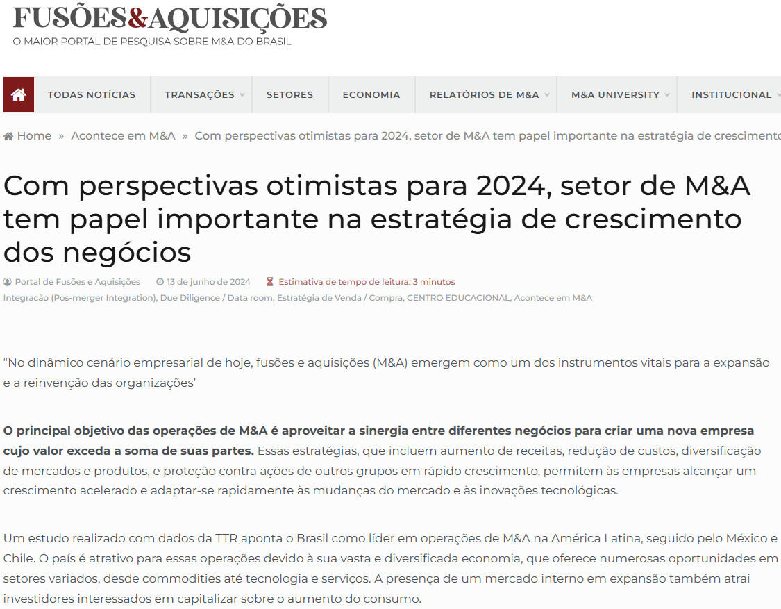 “No dinâmico cenário empresarial de hoje, fusões e aquisições (M&A) emergem como um dos instrumentos vitais para a expansão e a reinvenção das organizações’