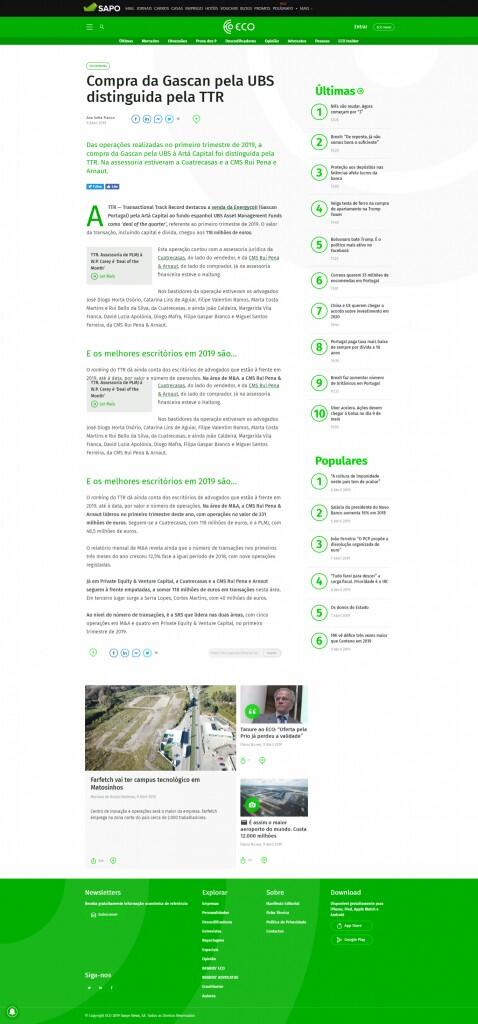 Das operações realizadas no primeiro trimestre de 2019, a compra da Gascan pela UBS à Artá Capital foi distinguida pela TTR. Na assessoria estiveram a Cuatrecasas e a CMS Rui Pena e Arnaut.