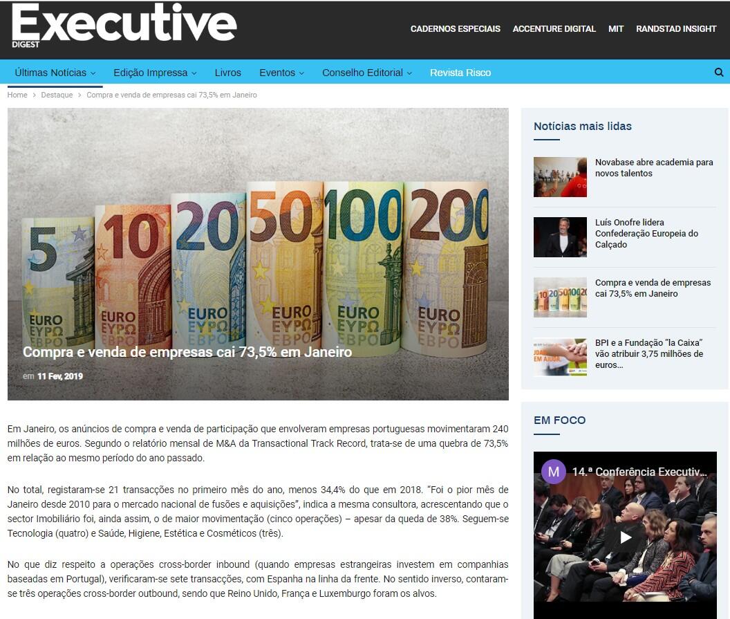 Em Janeiro, os anúncios de compra e venda de participação que envolveram empresas portuguesas movimentaram 240 milhões de euros. Segundo o relatório mensal de M&A da Transactional Track Record, trata-se de uma quebra de 73,5% em relação ao mesmo período do ano passado.