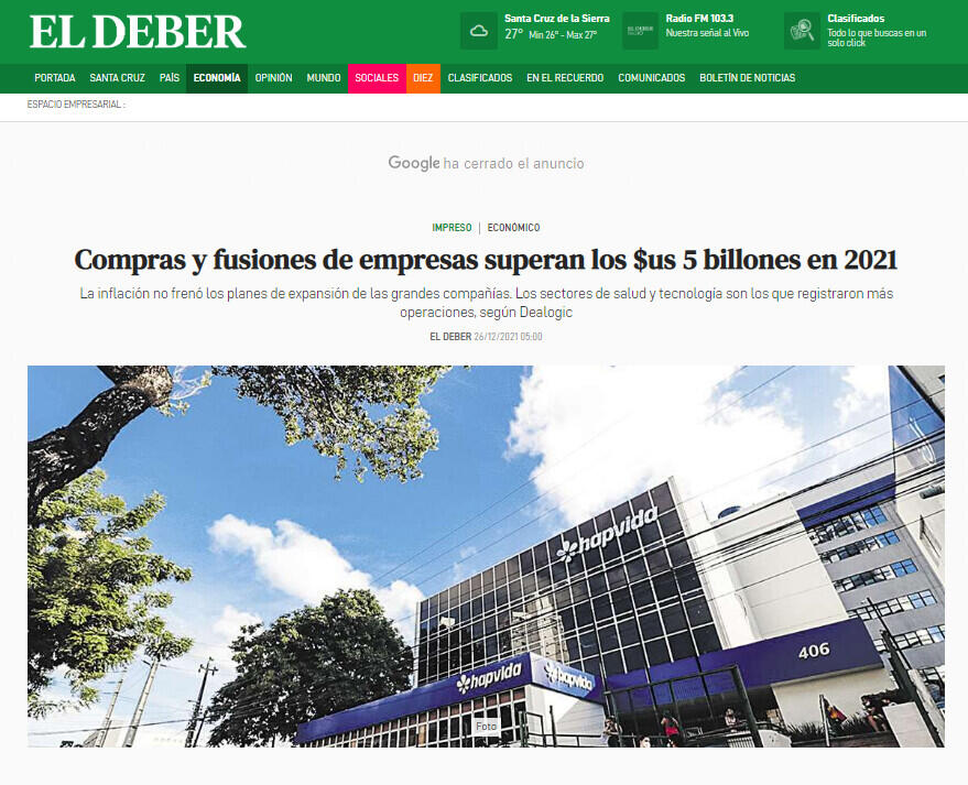 La inflación mundial es el fantasma que hoy asusta a las mayores economías. Sin embargo, los negocios no se detienen y la compra de empresas o fusiones baten récords. El valor de las fusiones y adquisiciones (conocidas por sus siglas inglesas M&A en jerga financiera) a escala mundial superó los $us 5 billones por primera vez en la historia, con volúmenes que aumentaron en un 63% hasta los $us 5,63 billones el 16 de diciembre, según datos de Dealogic, superando el récord anterior a la crisis financiera, de $us 4,42 billones en 2007.