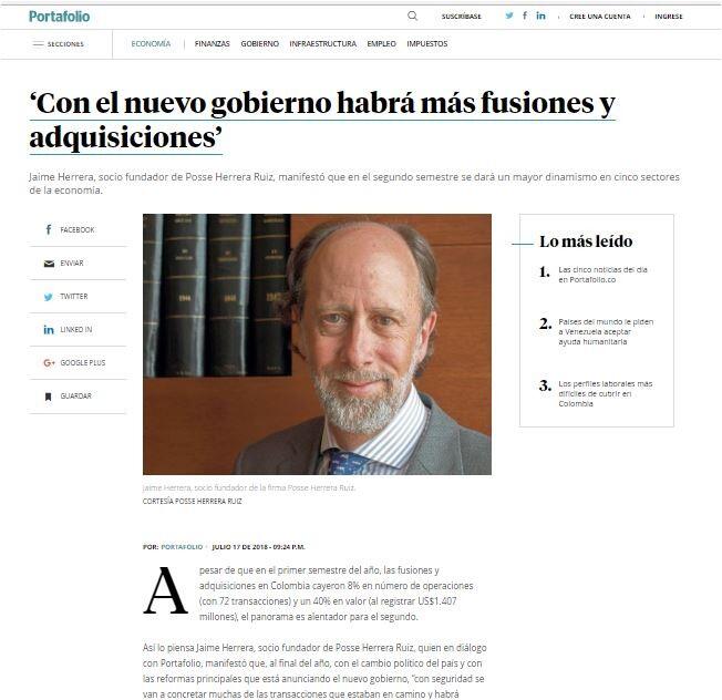 Así lo piensa Jaime Herrera, socio fundador de Posse Herrera Ruiz, quien en diálogo con Portafolio, manifestó que, al final del año, con el cambio político del país y con las reformas principales que está anunciando el nuevo gobierno, “con seguridad se van a concretar muchas de las transacciones que estaban en camino y habrá seguramente nuevas”.