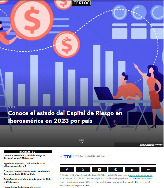 El Capital de Riesgo en América Latina en 2023 ha tenido 899 transacciones según informe anual de TTR Data, de las cuales 643 tienen un importe no confidencial agregado de US$5.004 millones, lo que supone una disminución del 30% en el número de transacciones y un descenso del 41% en el capital movilizado, con respecto a 2022.