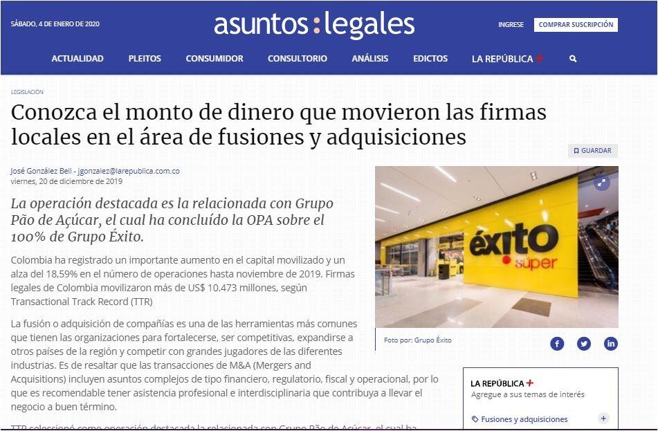 Colombia ha registrado un importante aumento en el capital movilizado y un alza del 18,59% en el número de operaciones hasta noviembre de 2019. Firmas legales de Colombia movilizaron más de US$ 10.473 millones, según Transactional Track Record (TTR)