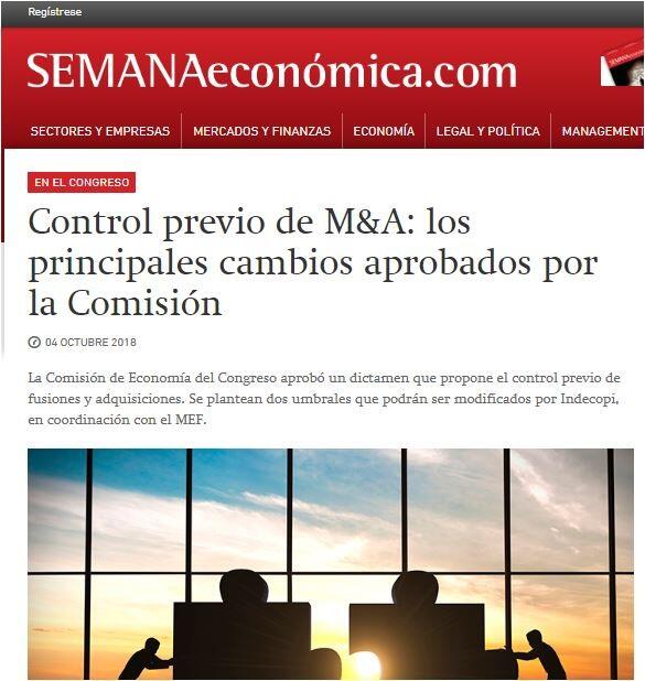 La posibilidad de regular las fusiones y adquisiciones volvió a tomar fuerzas en el Congreso. La Comisión de Economía aprobó un dictamen que propone el control previo de M&A. Si bien aún queda pendiente el debate en la Comisión de Defensa del Consumidor, se prevé que el dictamen sea debatido en el Pleno en el corto plazo dado que se habría llegado a establecer un umbral razonable, requisito solicitado por el Ministerio de Economía y Finanzas (MEF) y el Indecopi, organismo sería más fortalecido.