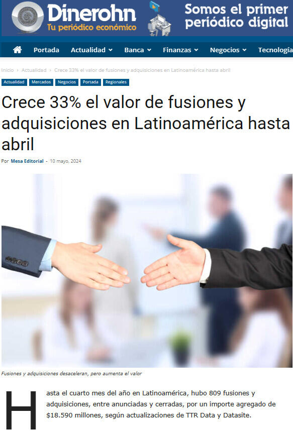 Crece 33% el valor de fusiones y adquisiciones en Latinoamérica hasta abril