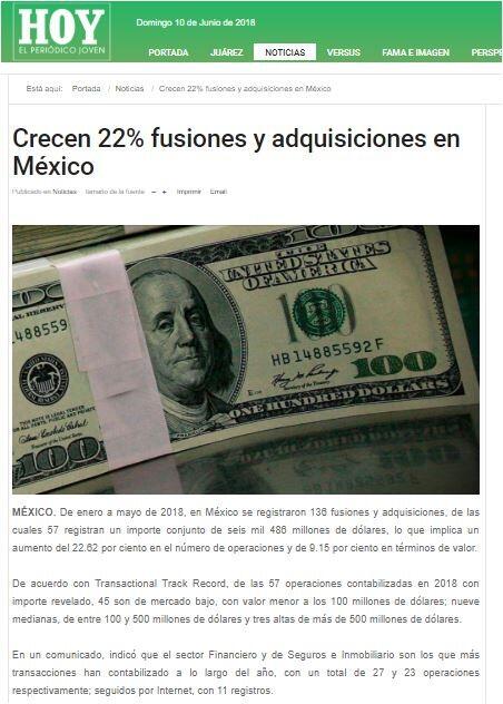 De enero a mayo de 2018, en México se registraron 136 fusiones y adquisiciones, de las cuales 57 registran un importe conjunto de seis mil 486 millones de dólares, lo que implica un aumento del 22.62 por ciento en el número de operaciones y de 9.15 por ciento en términos de valor.
