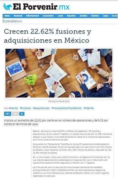 De enero a mayo de 2018, en México se registraron 136 fusiones y adquisiciones, de las cuales 57 registran un importe conjunto de seis mil 486 millones de dólares, lo que implica un aumento del 22.62 por ciento en el número de operaciones y de 9.15 por ciento en términos de valor.