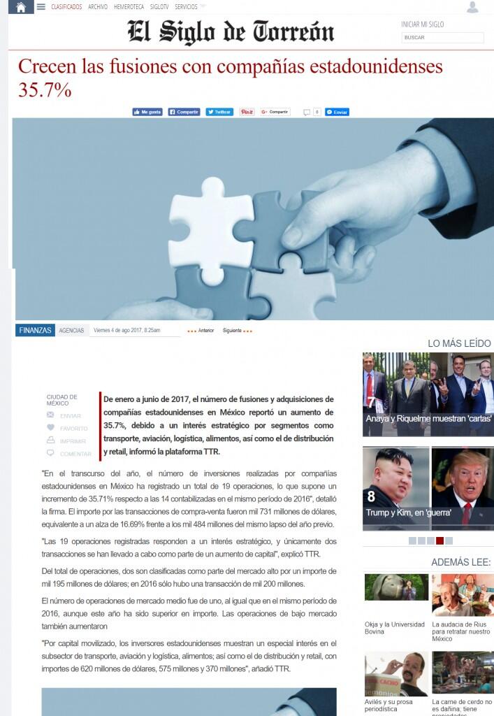 De enero a junio de 2017, el número de fusiones y adquisiciones de compañías estadounidenses en México reportó un aumento de 35.7%, debido a un interés estratégico por segmentos como transporte, aviación, logística, alimentos, así como el de distribución y retail, informó la plataforma TTR.