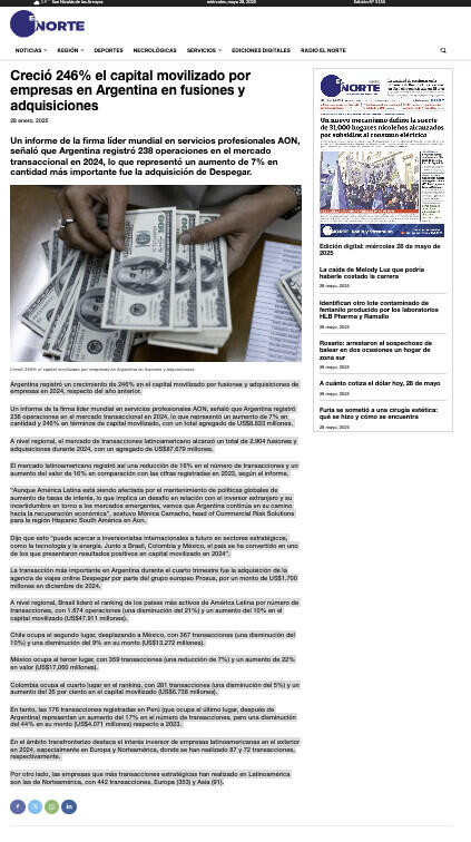Un informe de la firma líder mundial en servicios profesionales AON, señaló que Argentina registró 238 operaciones en el mercado transaccional en 2024, lo que representó un aumento de 7% en cantidad y 246% en términos de capital movilizado, con un total agregado de US$8.833 millones.